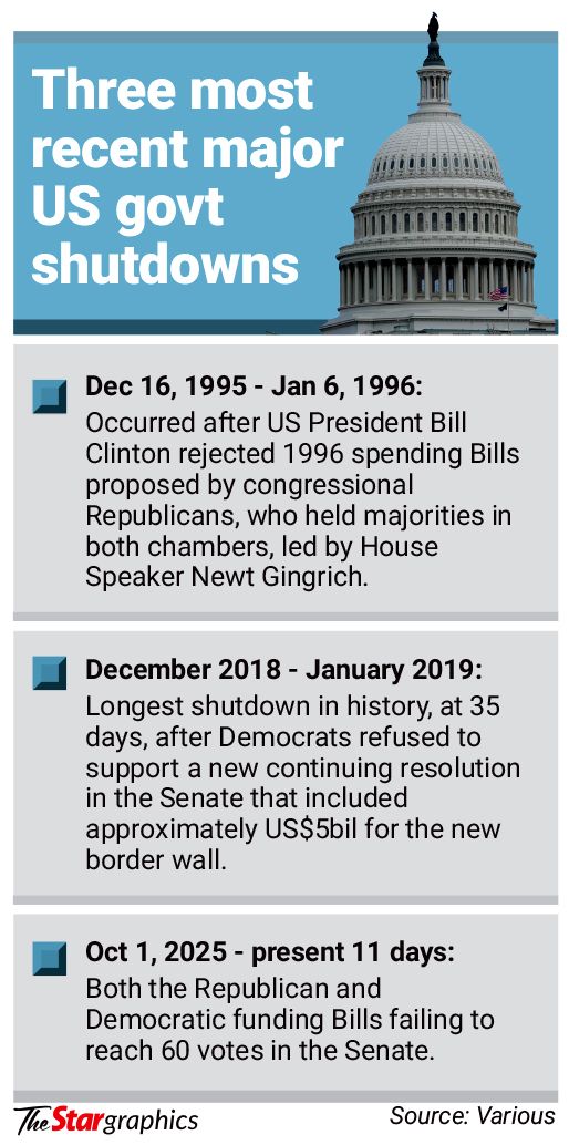 The US government shutdown, which began on Oct 1, was triggered by the US Congress’ rejection of a Republican funding Bill, resulting in some 750,000 federal government workers being furloughed without pay.