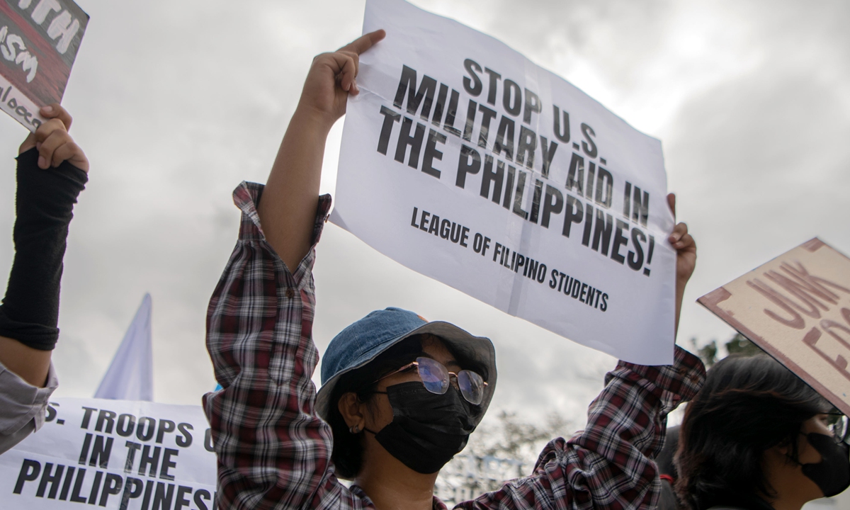 Activists stage a protest against US military presence in the Philippines, on February 2, 2023, in Manila, the Philippines, during the visit of then US defence secretary Lloyd Austin. Photo: VCG